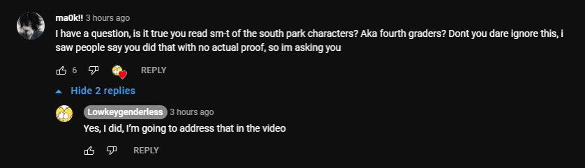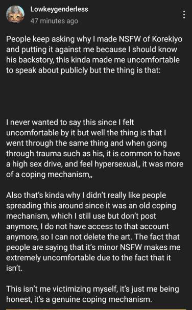 CPAgain. Never thought I'd associate craig with a label like this. But here we are anyway.Craig has openly admitted to reading smut of south park characters- literal CHILDREN. It is so disgusting that xe did this. X, these are minors. KIDS. YOU ARE READING CP.Craig has also uploaded artwork of amaguji onto r34, an nsfw website mainly for art. He has an argument for Rantaro not being a minor, and I understand where he's coming from. But never EVER did he justify that Korekiyo was an adult. It's heavily implied that the v3 characters are minors, and if Craig couldnt find any evidence of Korekiyo being an adult, he'd have to stick with the consensus that Korekiyo was a minor. And whilst we were still friends, me and Craig tried as hard as we could to find evidence that Korekiyo was an adult, but nothing we found could justify whether Korekiyo's a minor or not.**