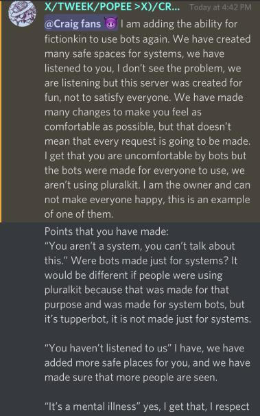 AbleismI never thought I'd have to talk about Craig associating with ableism, but here I am. :(Craig's server (NOW OWNED BY ME LMAO !!!!) has gotten into literal shambles recently, with the 300+ channels and out of control members. But what really set the bomb off was when Craig decided to ignore a majority of the systems in his server for his own comfort.For context, systems in the server have tried expressing their discomfort being in the server (by fickins using bots who dont need them 2 show off their kin, how systems were being grouped with fickins, etc). In their discord server, they had the Tupper bot in the server and allowed people who weren’t systems to use it, which makes systems feel mocked. Craig changed the rule and then changed it back, making systems extremely upset that their voices weren’t being heard and they were being ignored. Craig went online to explain the situation, and proceeded to speak over systems and try to give their “opinion”, which wasn’t their place as they weren’t a system. It took them 50 minutes- 50 MINUTES to apologize to systems. Actually, no. It took him HOURS- HOURRSSSSS to apologize to them. Systems begged for hours on end, only to be ignored until the following day. That's so fucking shitty on his part. The way he wants people to listen to him, but doesnt listen to others. If he does listen to others, he'll just brush it off or find a way to make the situation about his opinon.His apology; https://youtu.be/Rkh9CBk1cYQCraig has also misused tone tags multiple times, which I find really horrible.